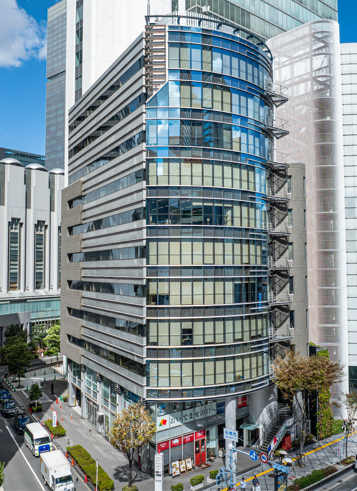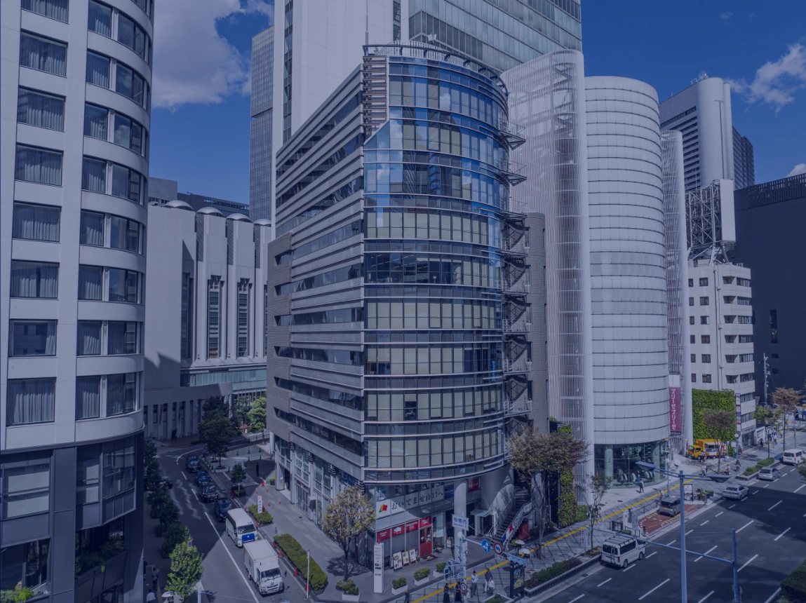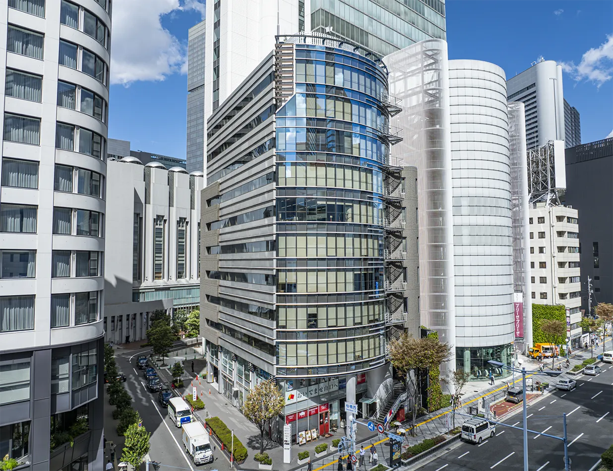 大阪・梅田にある洗練されたオフィスビル。曲線を生かしたミラー張りの外観が、明るくシャープな印象です。国道2号線に面した角地という好立地にありながら、中心地の喧噪とは一線を画し、落ち着いたビジネスシーンを演出します。