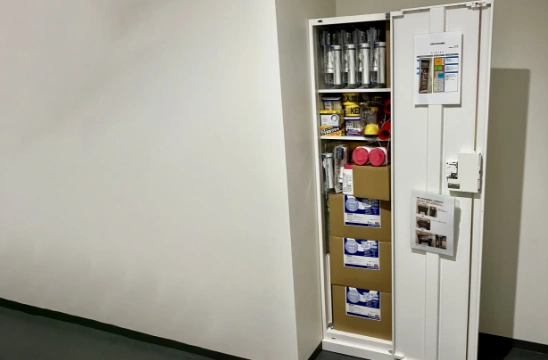 防災ラジオ、応急処置セット、ランタン、簡易トイレ等が入った防災ロッカーを設置。
