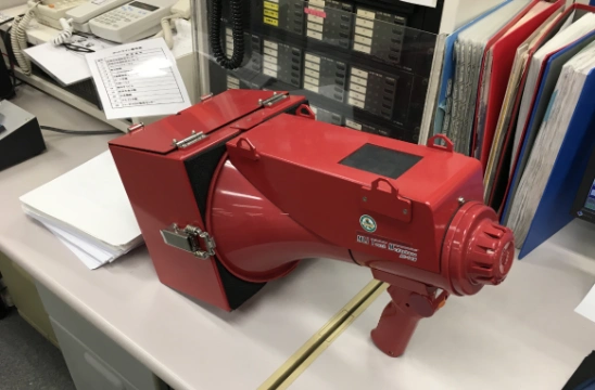 防災センターに多言語対応メガホンを設置しており、有事の際、非常放送を最大4か国語 (日本語、英語、中国語、韓国語)で放送できる体制を整えています。