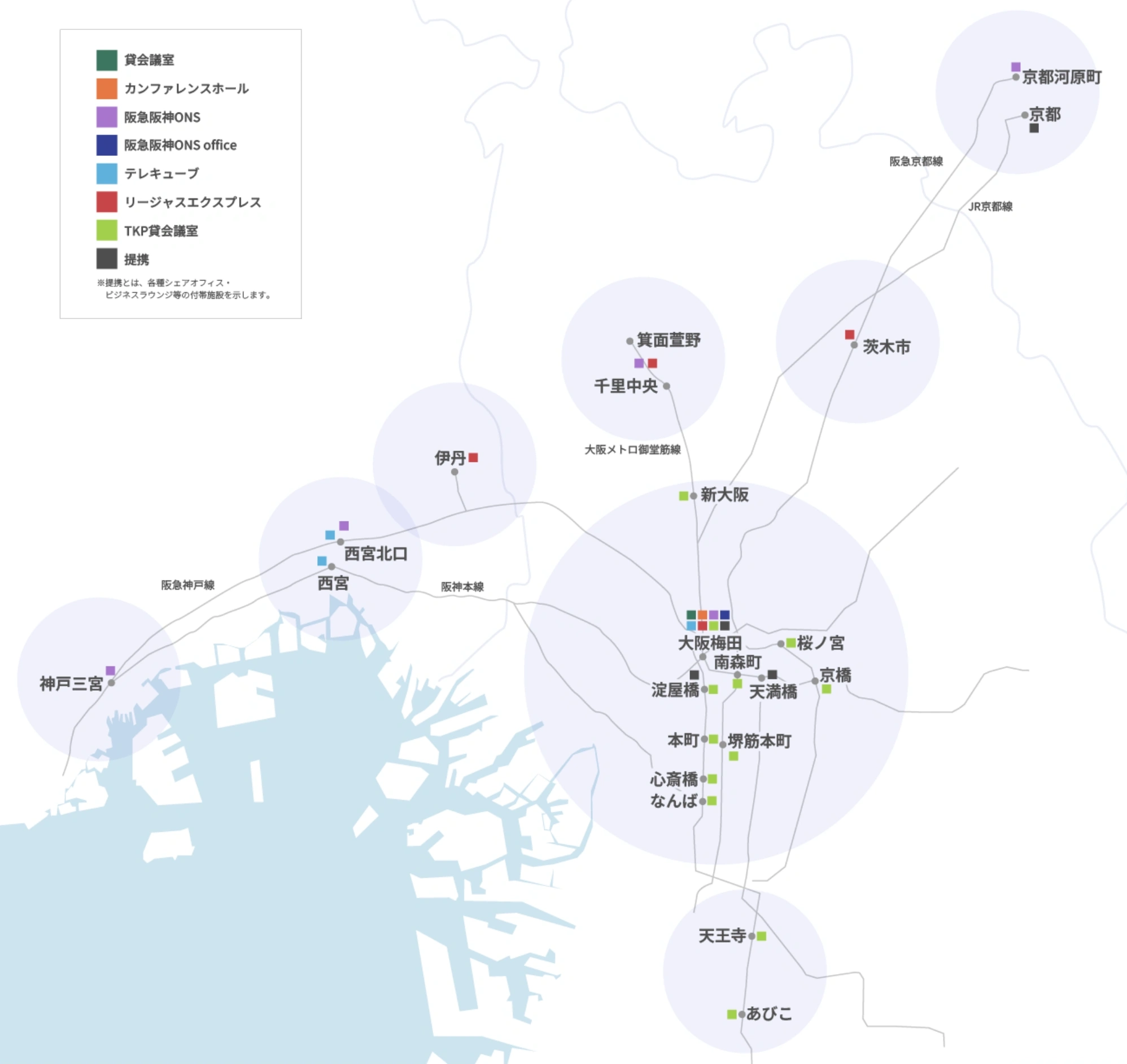 デスクや照明を備えた快適な環境を、阪急阪神沿線のターミナル駅を中心に展開。